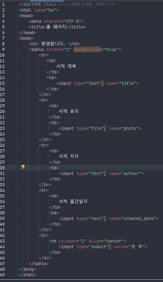 3. colspan : column의 칸 2개를 사용, border : 두께, bordercolor : 색상 (위의 경우 table에 사용되므로 표의 속성)