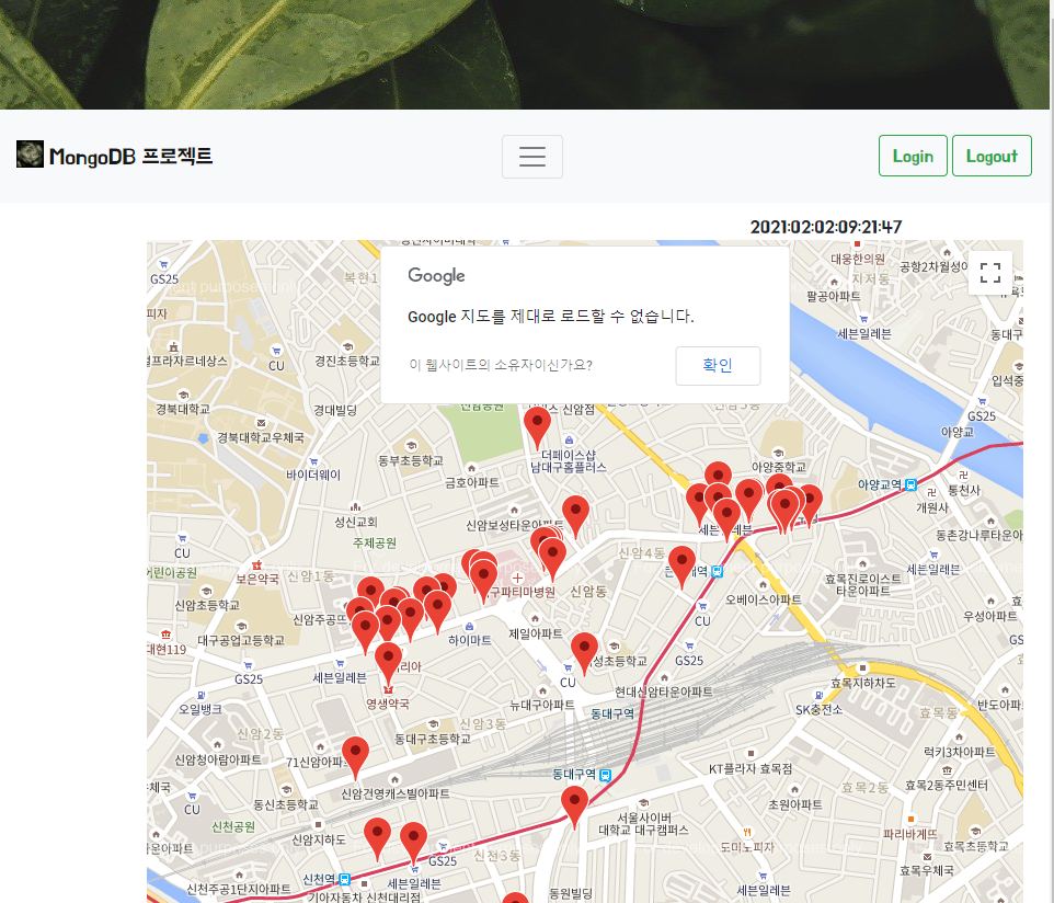 3. 결과 화면(로컬로 접속한 이후 가동할 수 있도록 DB를 로컬로 넣음 - 커서를 댈 경우 약국이름 표시)