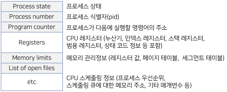 - 각 프로세스는 OS에서 PCB라는 자료 구조에 의해서 표현됨.