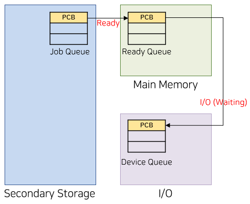 - Job Queue : Job scheduler에 의해 유지되는 자료 구조로, secondary storage에 있는 프로세스를 메모리에 적재할 때 해당 스토리지에 형성되어 있는 queue.